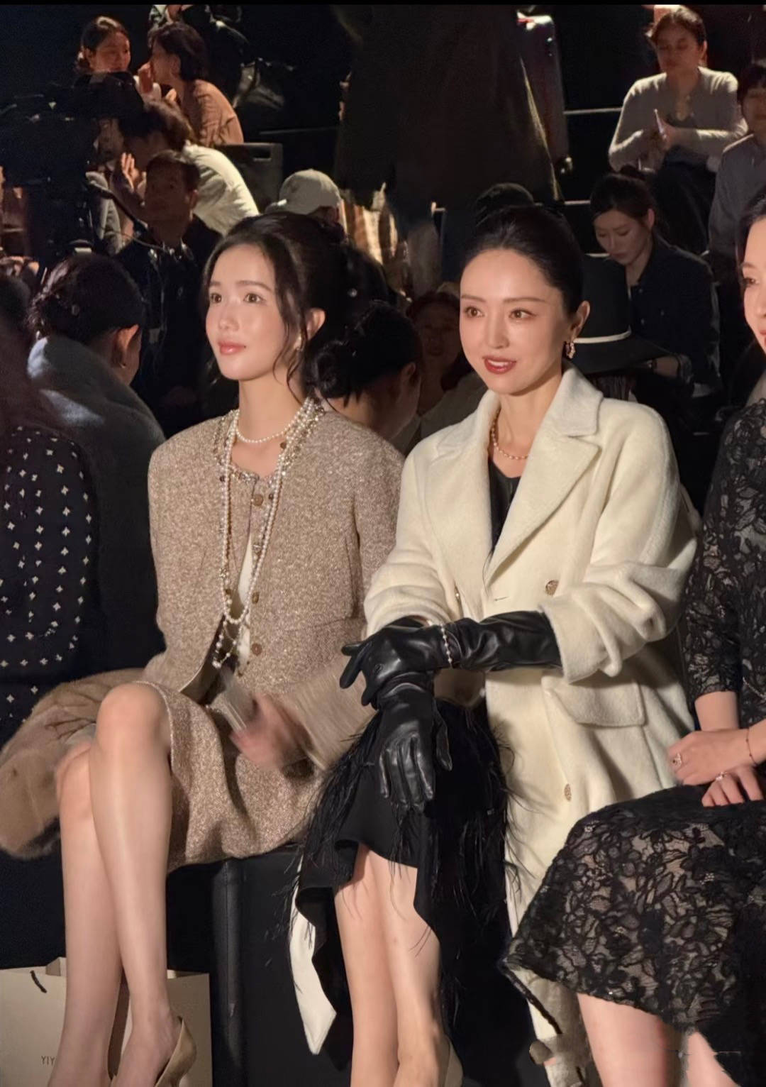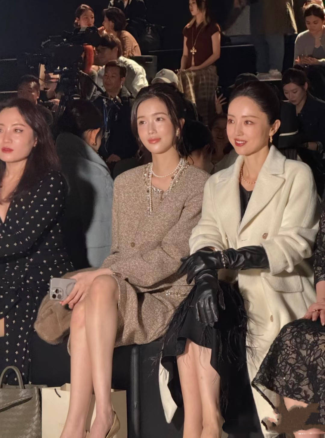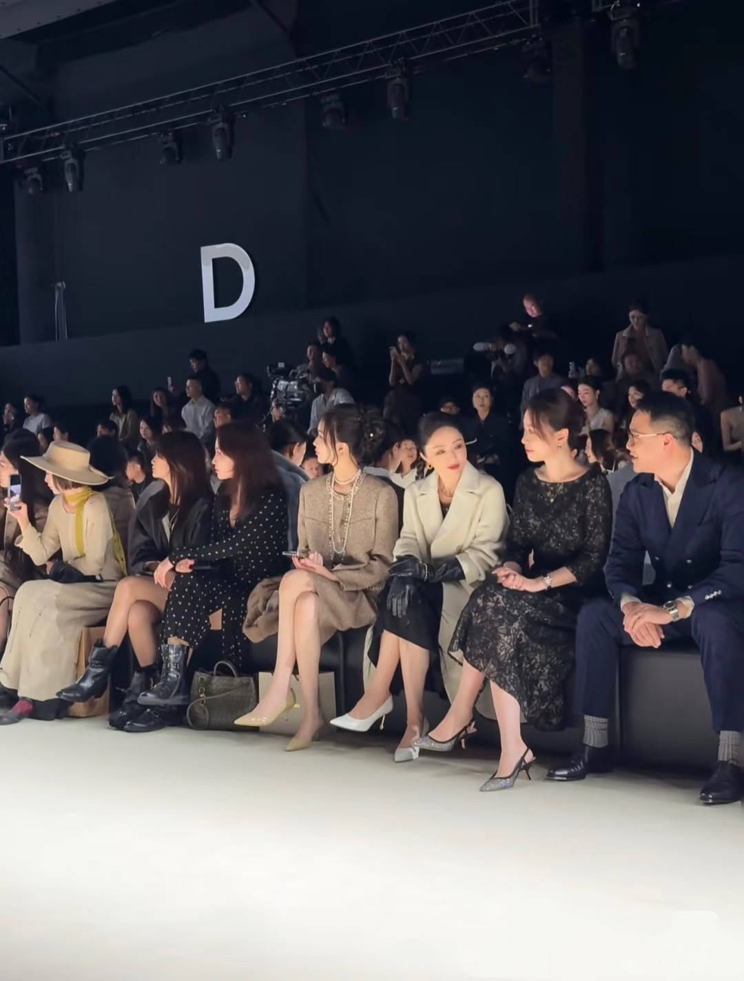 10月14日的上海时装周上,董璇高调现身,打扮得十分考究。一身黑白配色的复古造型,散发出浓浓的“赫本风”气质。她身穿白色羊绒大衣,搭配黑色羽毛裙和黑色皮手套,脚踩白色浅口高跟鞋,整体造型优雅而贵气。坐在观秀席上,董璇面带微笑,举止得体,尽管已接近五十岁,她仍保持着女明星特有的风度与优雅。