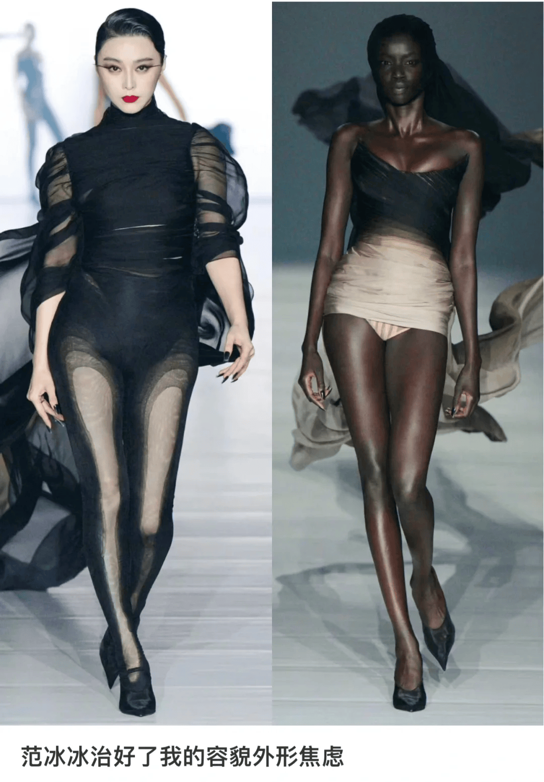 这让我想起去年巴黎时装周,范冰冰被请去走秀那件事。她穿着黑色网纱礼服,气场还在,但跟身边那位腿长两米的黑人超模一比,立马显得“腿短腰粗”、步伐僵硬。