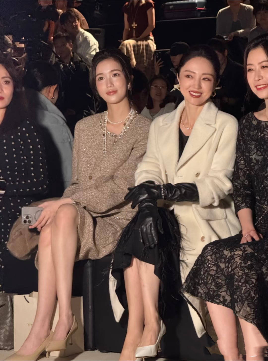 10月14日的上海时装周上,董璇高调现身,打扮得十分考究。一身黑白配色的复古造型,散发出浓浓的“赫本风”气质。她身穿白色羊绒大衣,搭配黑色羽毛裙和黑色皮手套,脚踩白色浅口高跟鞋,整体造型优雅而贵气。坐在观秀席上,董璇面带微笑,举止得体,尽管已接近五十岁,她仍保持着女明星特有的风度与优雅。