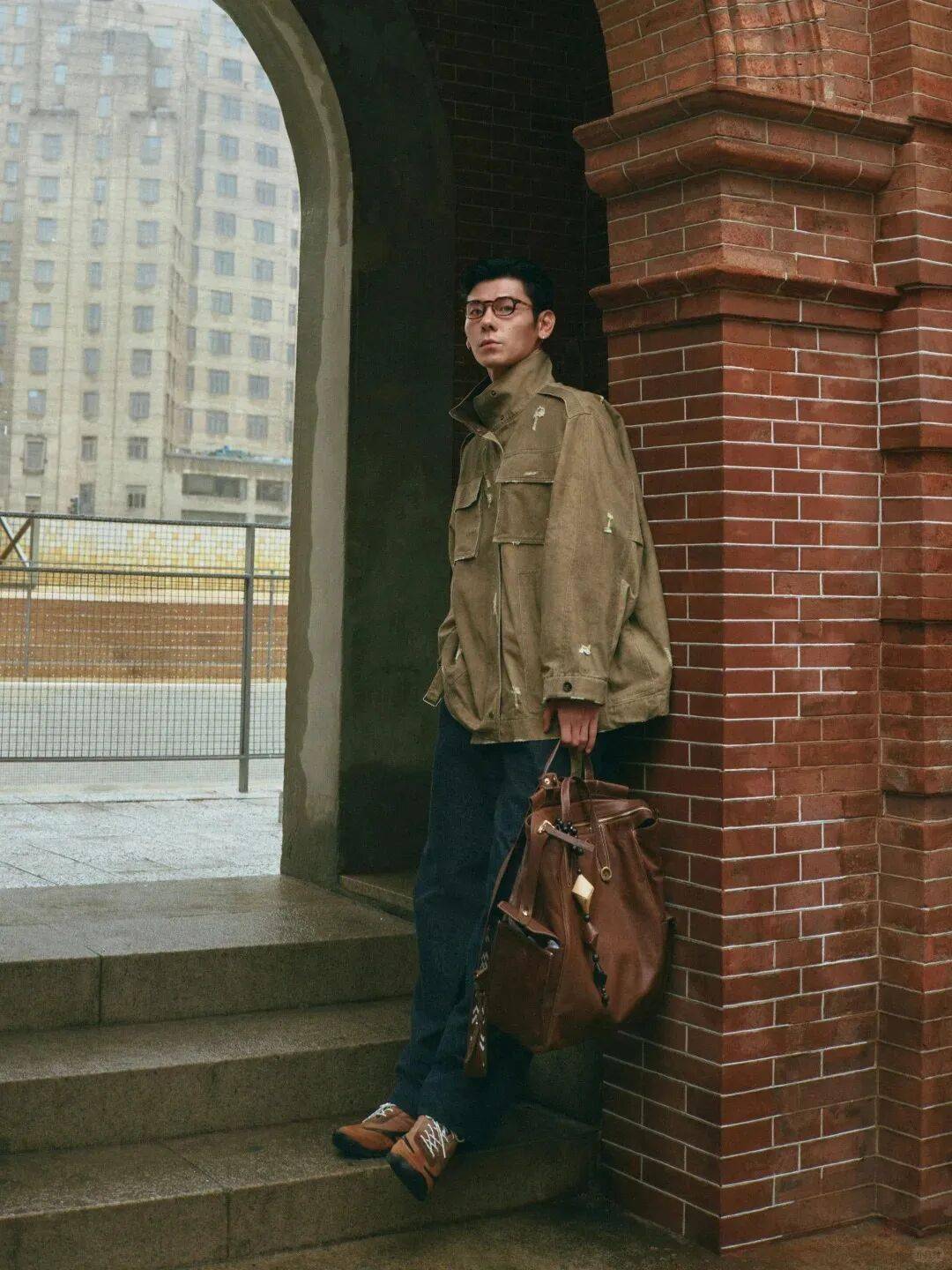 戴上眼镜的蒋奇明,又将自带的痞帅气质完美融入知识分子风。硬挺的做旧夹克搭配简约的挎包,点缀在细节之中的民族感配饰,以及看似斯文的“书呆子眼镜”,给人一种复古忧郁的故事感。